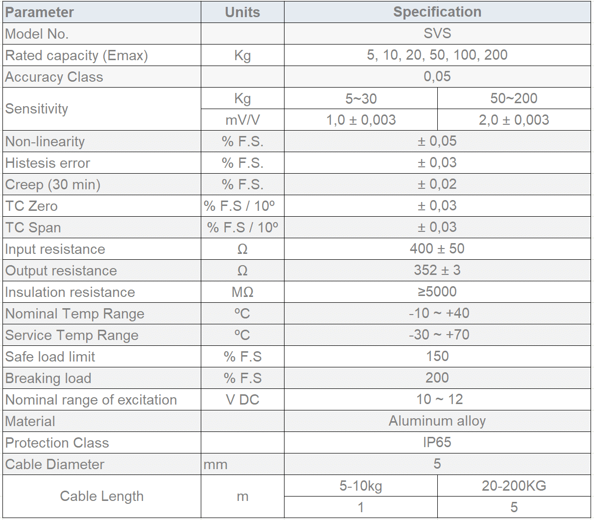 SVS Load Cell Specifications: